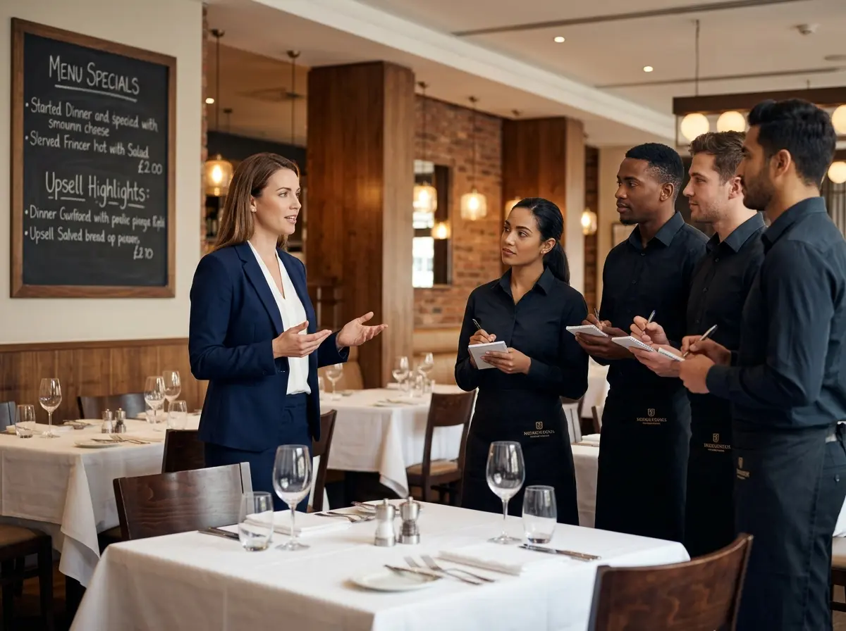 Train your servers to upsell at natural moments in the dining experience: suggesting a wine pairing when the entrée is ordered, offering a starter when the table is still deciding, or mentioning a dessert special before the check is requested. Role-play these scenarios during pre-shift. Have servers practice the language out loud — because there's a significant difference between a server who knows the right approach and one who can execute it under pressure with a four-top staring at them.
